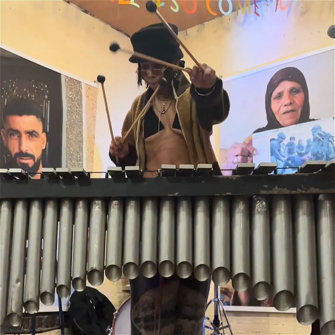 Hudson River at the vibraphone onstage at Studio 34. Background portraits by Aisha Mershani/La La Lil Jidar.